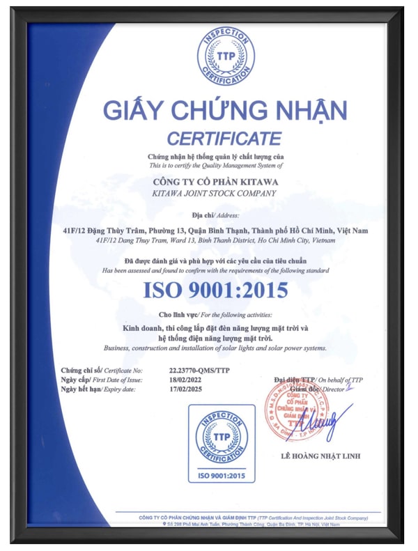 Các sản phẩm đèn năng lượng mặt trời của Kitawa đáp ứng đầy đủ tiêu chí về chất lượng và đã xây dựng được thương hiệu uy tín trên thị trường. Điều này đã đưa chúng tôi trở thành lựa chọn hàng đầu của nhiều khách hàng. Với khả năng cung cấp số lượng lớn sản phẩm cho các dự án và công trình trong nhiều năm, Kitawa tự tin khẳng định vị thế là nhà cung cấp hàng đầu về sản phẩm năng lượng mặt trời hiện nay.