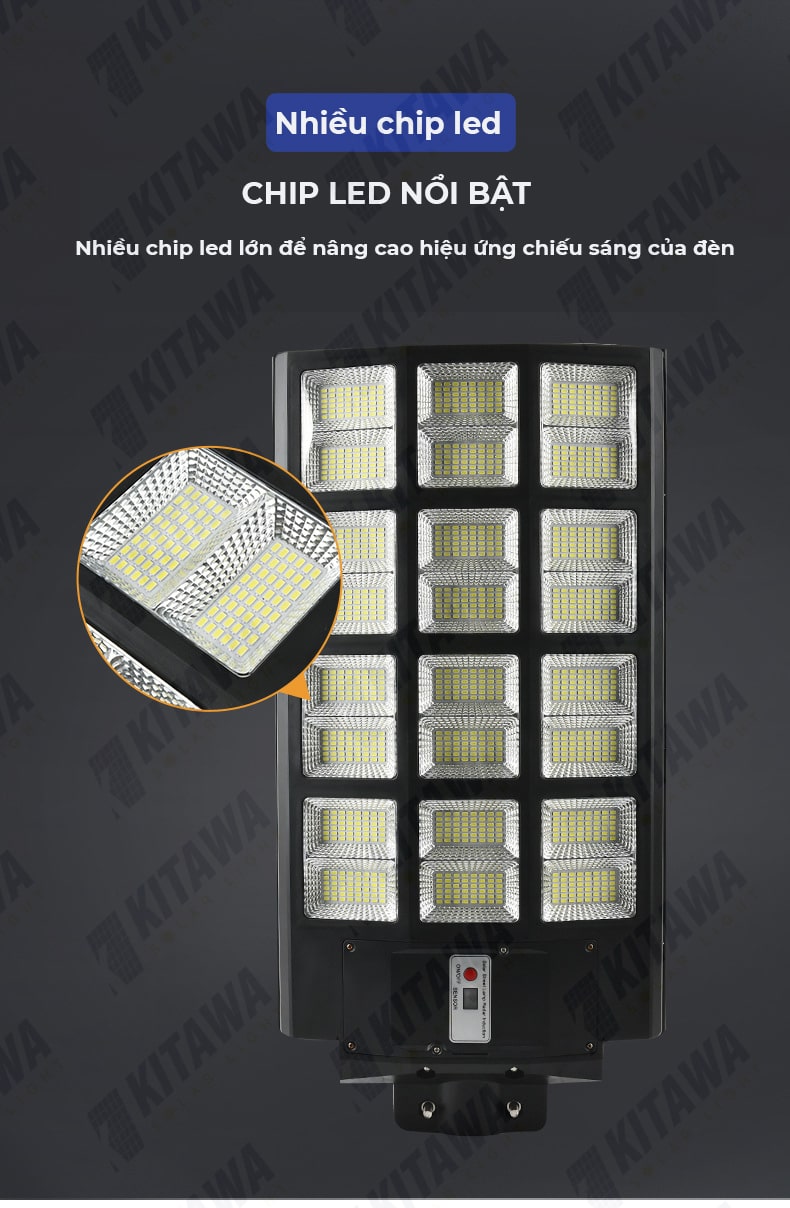 Đèn đường năng lượng mặt trời liền thể 600W cũng được trang bị Chip Led chất lượng. Với chip LED SMD giúp tuổi thọ cao hơn so với các loại Led thông thường khác và giữ được mức độ đều màu cao hơn. Tuổi thọ LED là hơn 50.000 giờ (tương đương 12 năm sử dụng). Ngoài ra đèn thiết kế mỗi chíp Led sẽ có một thấu kính khuếch đại gắng kèm giúp phân bố ánh sáng được đồng đều hơn.