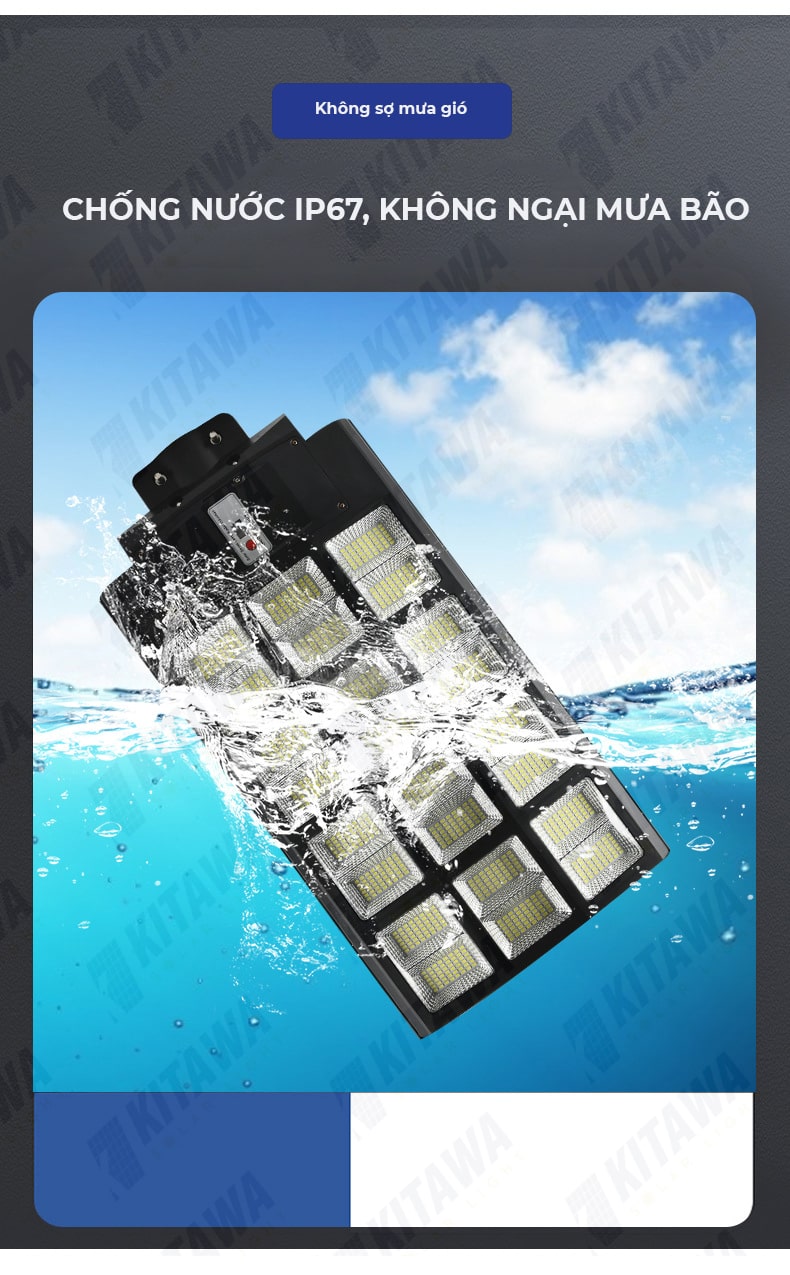 Đèn đường năng lượng mặt trời liền thể 600W KITAWA được trang bị chuẩn IP67 có khả năng chống bụi và chống nước vượt trội để bạn yên tâm lắp đặt ngoài trời và sử dụng trong mọi điều kiện thời tiết