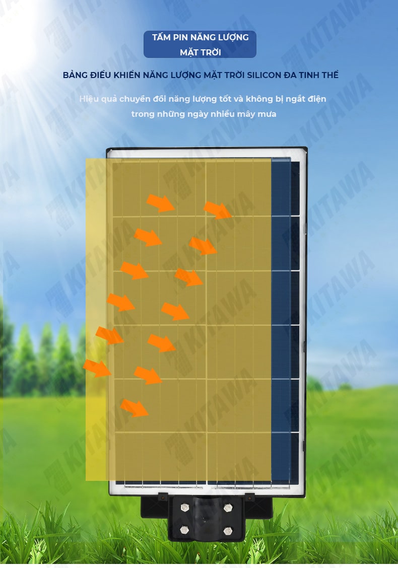 - Tấm pin đa tinh thể Polysilicon giúp đèn sạc nhanh chóng. Pin có thể được sạc đầy chỉ từ 4-6 giờ nắng tiêu chuẩn.