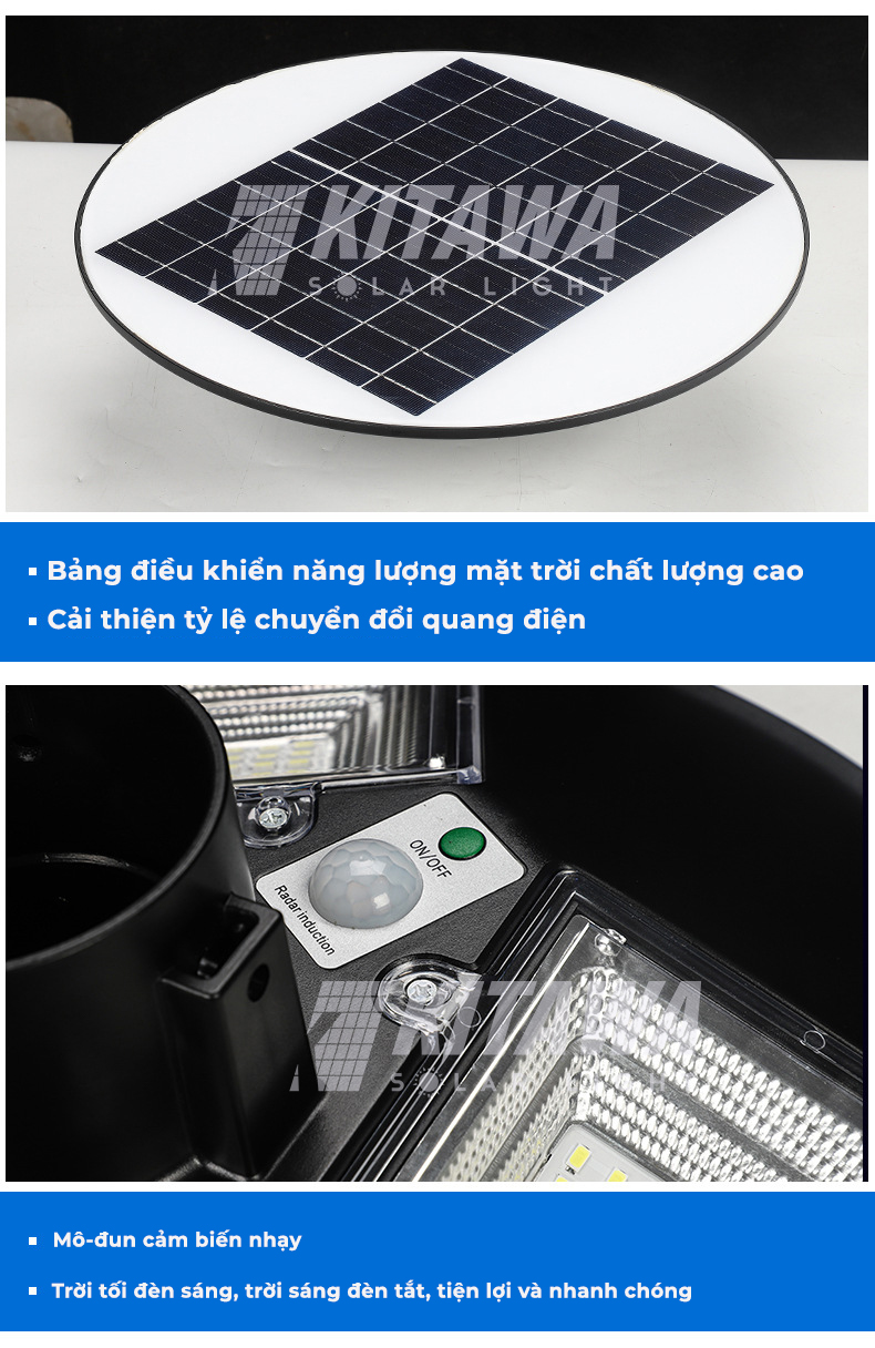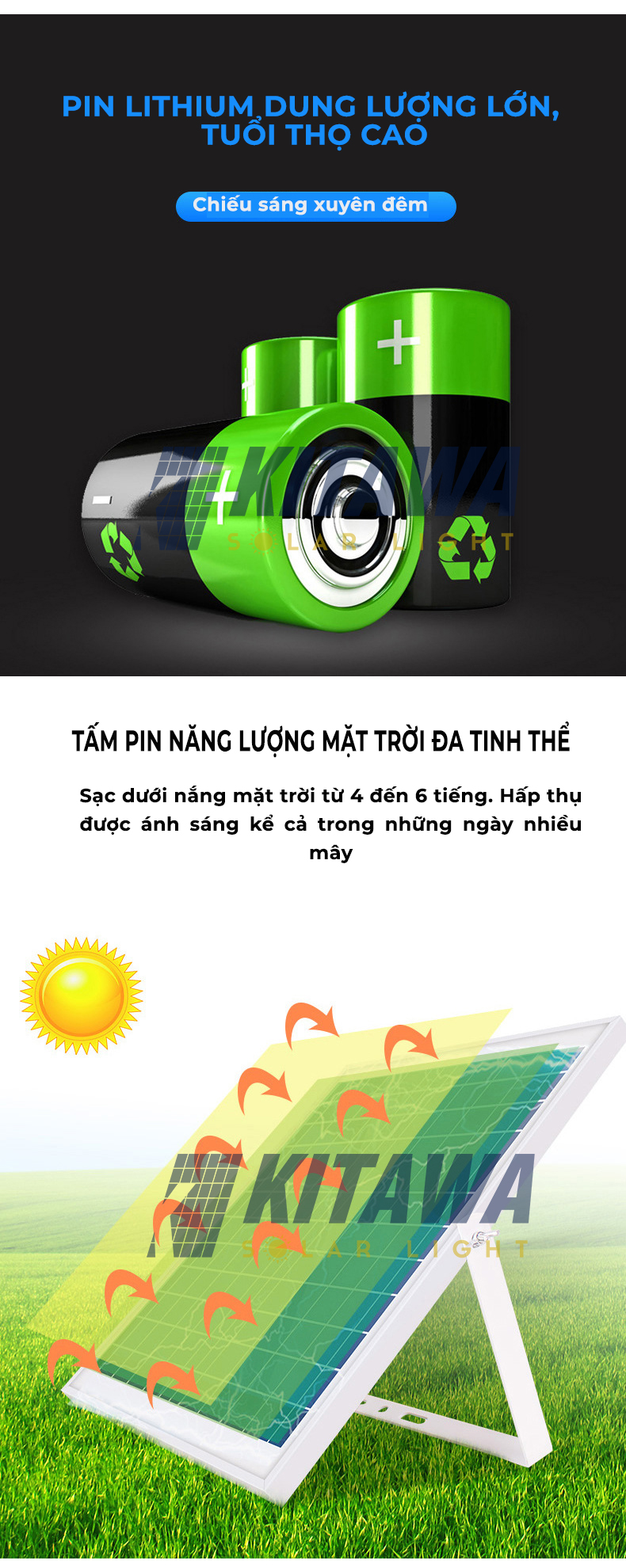- Tấm pin năng lượng mặt trời chất lượng cao và có diện tích lớn, hiệu suất chuyển đổi năng lượng cao, đèn tích trữ năng lượng nhanh cho quá trình hoạt động tốt nhất. Ngoài ra, tấm pin còn được điều chỉnh theo hướng nhận ánh sáng tốt nhất.